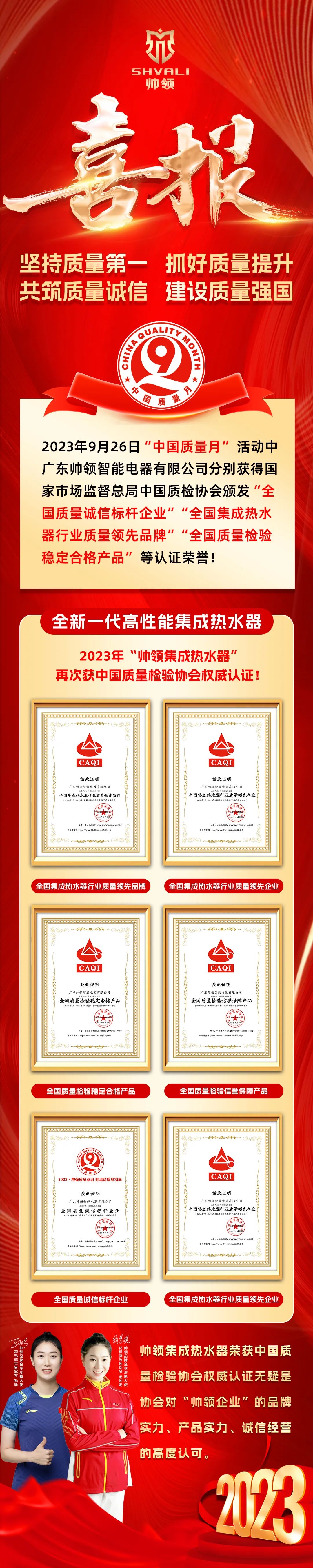 荣誉加冕三连冠-帅领电器再获【2023年质量月】"全国质量诚信企业""集成热水器质量品牌""集成热水器质量合格产品"