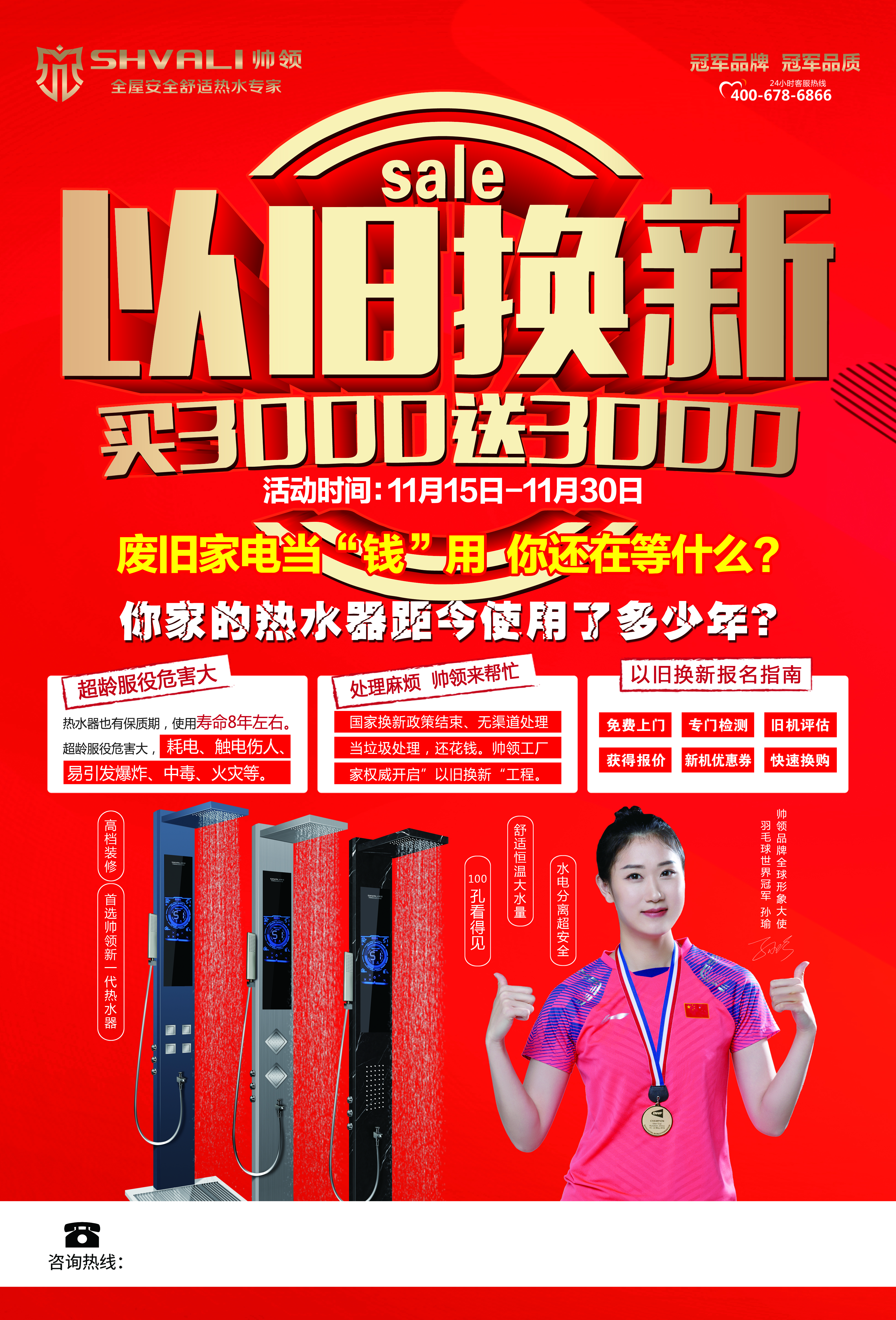 针对旧房装修改造用户,活动方案规定,每拆除1台传统热水器(包括太阳能热水器、桶装电热水器等),并选购安装1台“帅领”集成热水器,将按不同型号享受500元至1000元不等的换购补贴。同时,凡进店客户、有意向客户、订购客户均可获赠几元到几百元不等的随手礼品。
