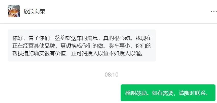 这一消息立即引发“蝴蝶效应”:10月29日,陕西西安读者“欣欣向荣”留言称,看了我们的报道,我“真的很心动”。他现在正在经营其他品牌,但“真想换成你们的做”。他认为,“奖车事小”,但帮扶措施“很有价值,正可谓授人以鱼不如授人以渔。” 甘肃临泽专卖店代总非常看好“帅领”的帮扶政策,经过短短两天的交流,于10月30日火速签约。他说,“帅领”是干事的,不是“割韭菜”的。无独有偶,10月29日至31日,天津、吉林、辽宁、内蒙古、宁夏以及甘肃平凉、嘉峪关、庆阳、白银等地也有读者打4006786866电话咨询建店,目前正由招商部门做前期对接工作,有的已经进入选址阶段。