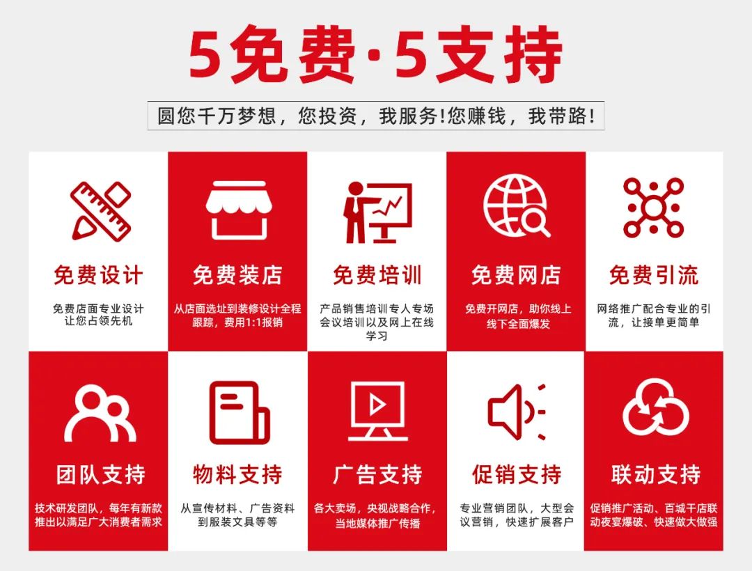 五免费,即免费设计、免费装店、免费培训、免费网店、免费引流;五支持,即团队支持、物料支持、广告支持、促销支持、联动支持。