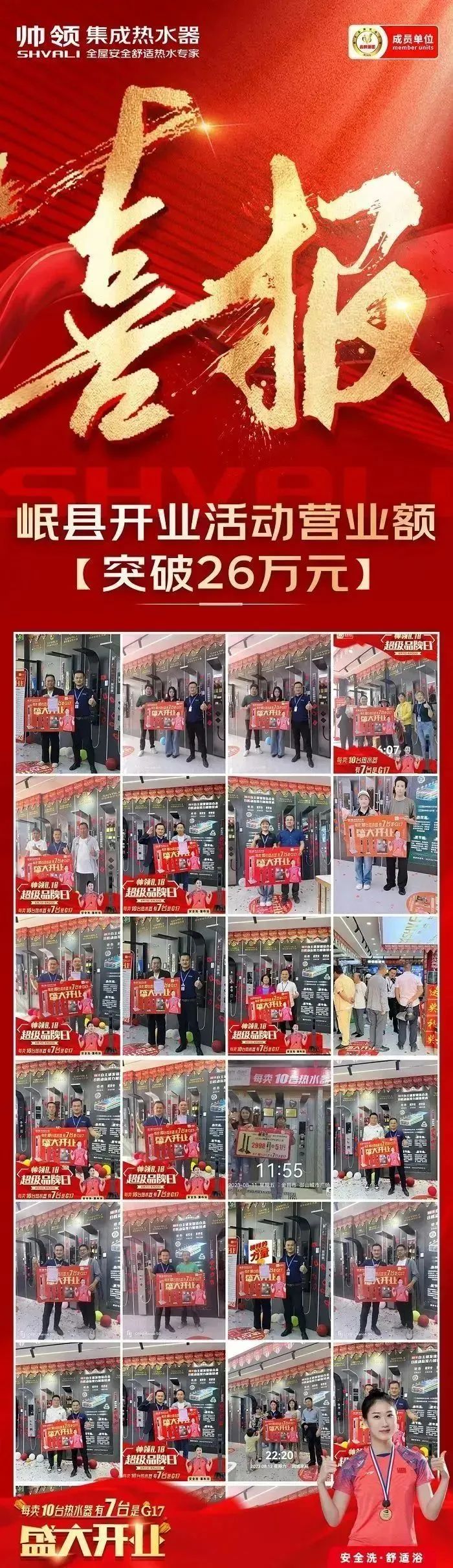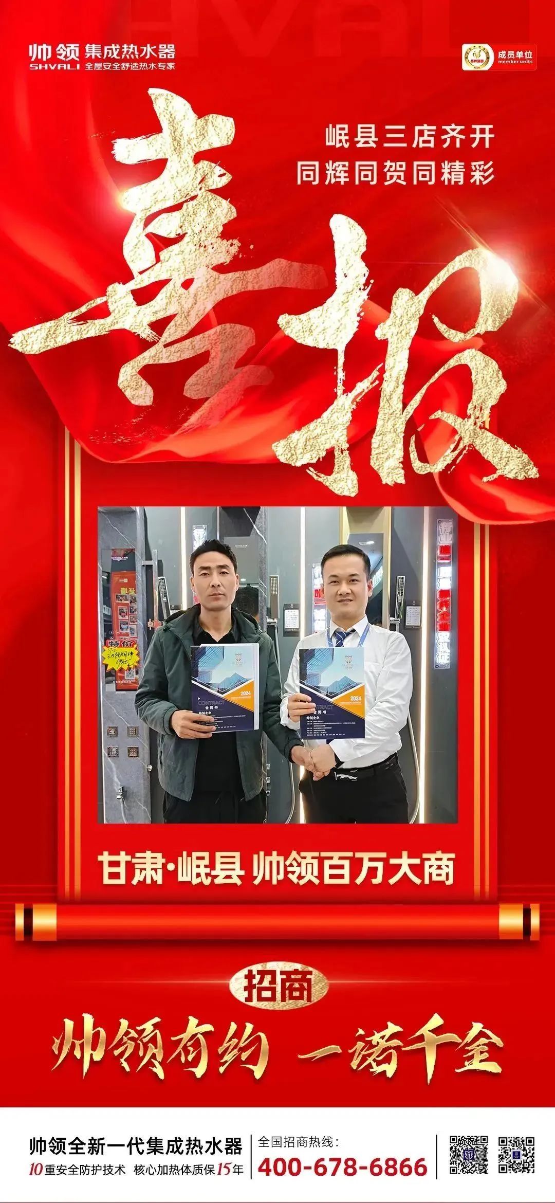 2024年,帅领开工首日,来自甘肃岷县的经销商张总致电祝贺,并送来喜报,他将与帅领签订2024年200万合同,与此同时,岷县第三家帅领集成热水器专卖店将于近期装修开业!