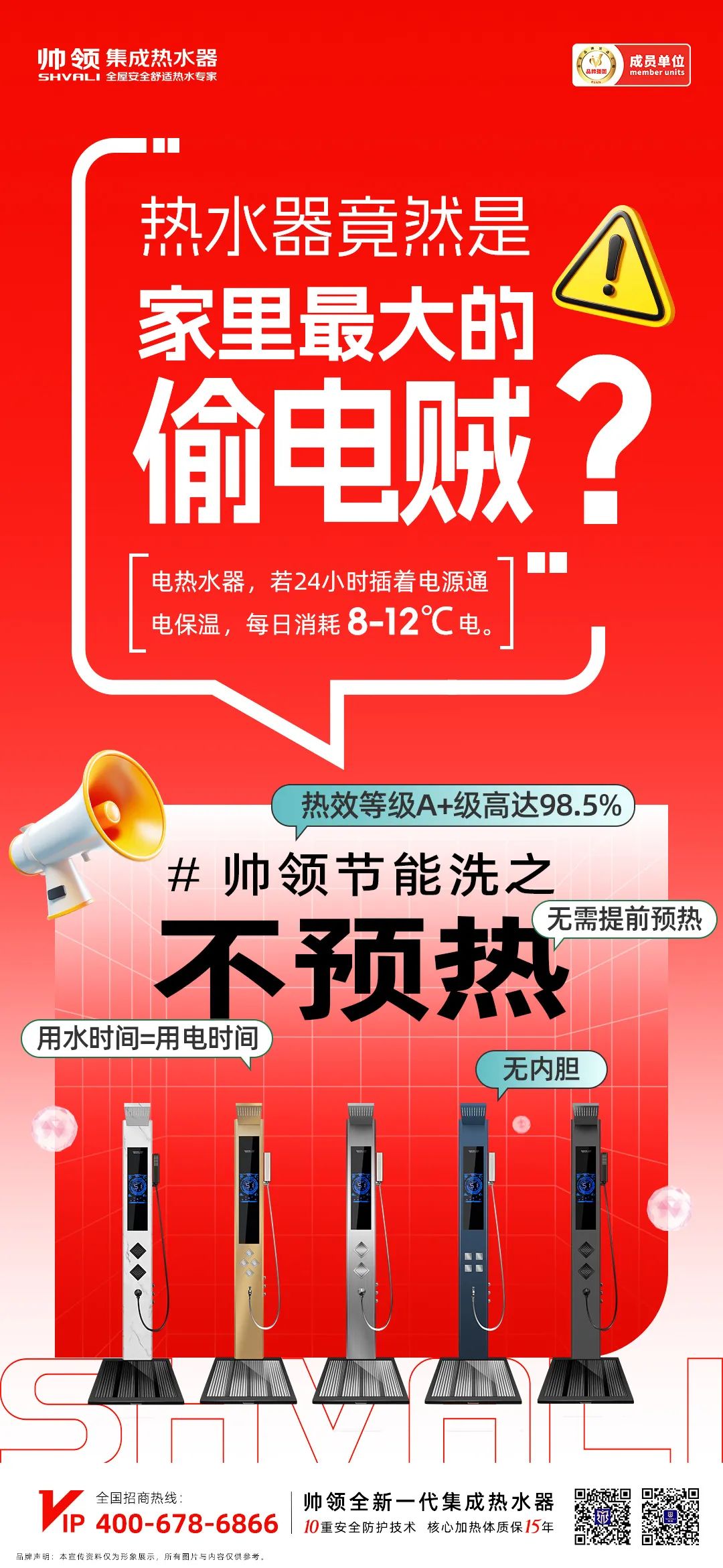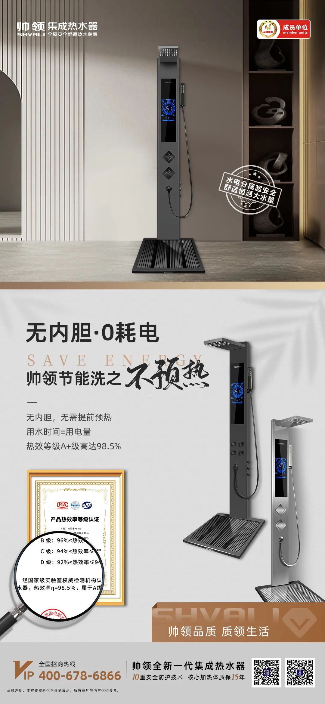 帅领集成热水器,洞察热水市场耗电费水的多处痛点,升级迭代出行业领先的第八代镍铬合金8核动态加热体接力技术,区隔市场常见的储水式热水器,无内胆,无需提前预热,用水时间=用电时间,热效等级高达A+98.5%。