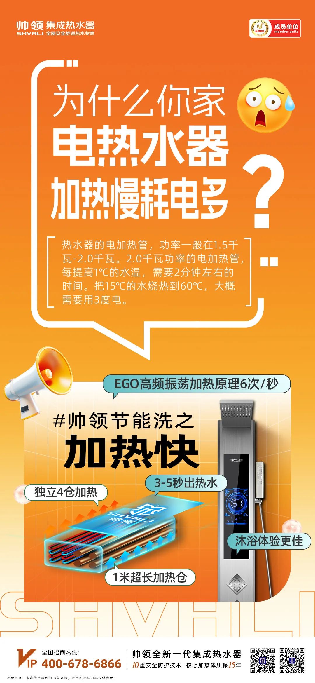 同时,帅领精研热水器市场痛点问题,其他集成热水器瞬间启动功率较大、对线路要求较高(需要4平方毫米以上铜芯线)的问题,“帅领”集成热水器也有了完美地解决方案——镍铬合金8核动态接力加热技术,将平均功率降低至2700W-3200W,使用时加热,不使用时处于待机状态,且5分钟自动息屏。仅需要2.5平方毫米铜芯线即可满足安装需要,大大方便了居民家庭安装使用。不仅如此,作为行业唯一的双保产品(行业唯一中国人民保险、太平洋保险联合承保)更有1 年整机质保、3 年电子元件质保、15 年加热体质保。
