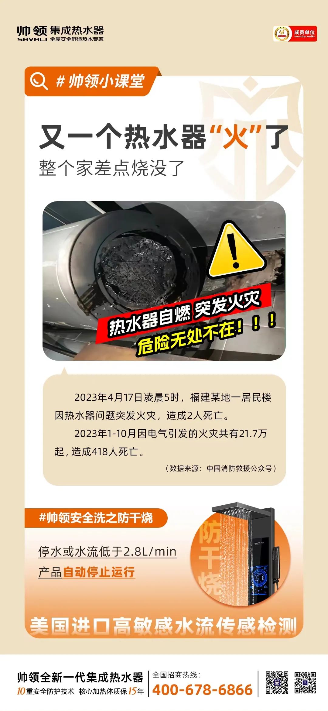 2021年,洞悉市场等安全问题弊病,帅领深耕广东顺德(全球制造业中心)精研技艺,以【用良心做人,匠心造产品】的产品理念,研发出革新行业的镍铬合金8核动态接力加热技术,以百分之百玻纤尼龙绝缘材质,多重抗干烧技艺,加持美国进口高敏感水流传感检测,停水或水流低于2.8L/min,产品自动停止运行。更有温控探头实时检测温度。超过65°c,产品将在0.01秒内切断电源。多重细节防护,保护每一次沐浴安全。作为行业一流的全屋安全舒适热水定制专家,目前,帅领集成热水器已在覆盖全国300+门店,成为百万家庭的信任之选。