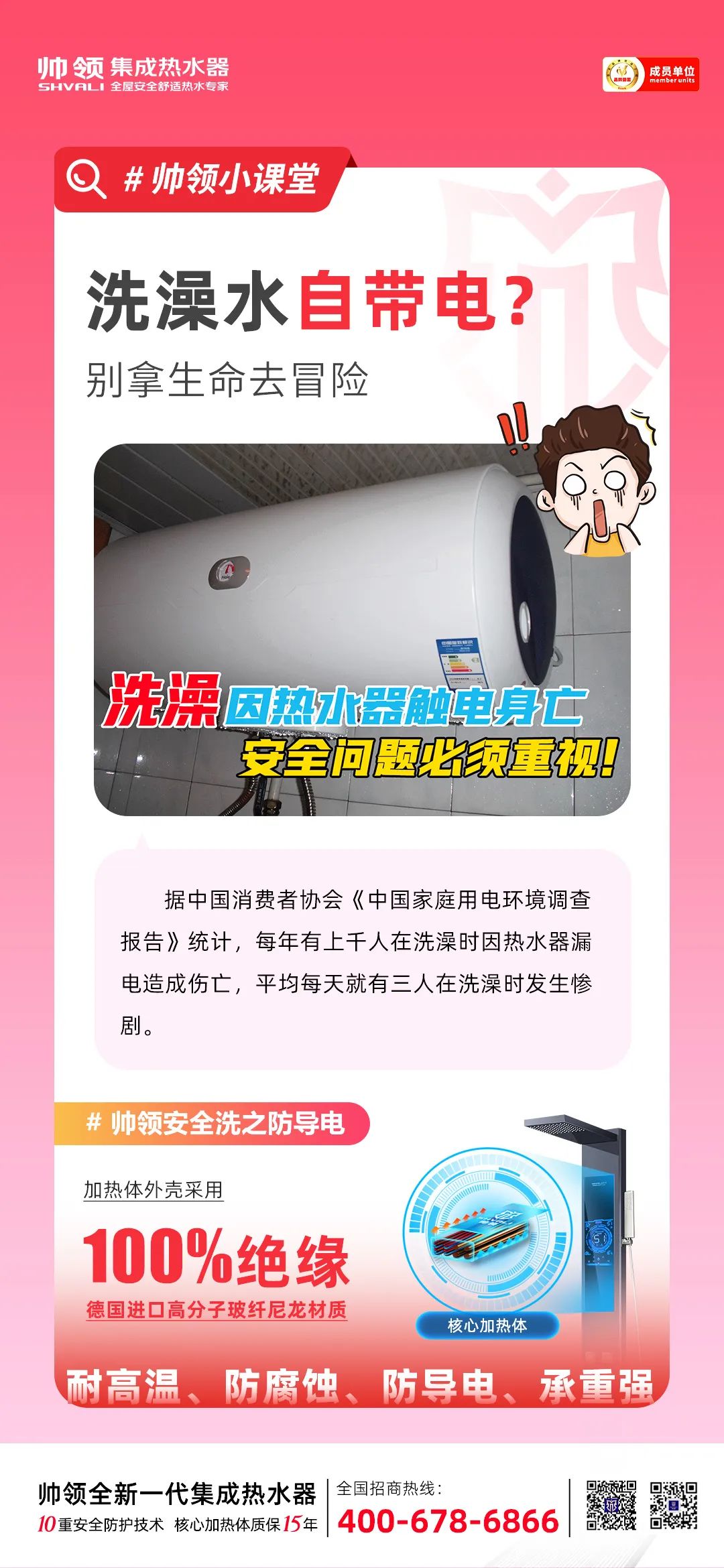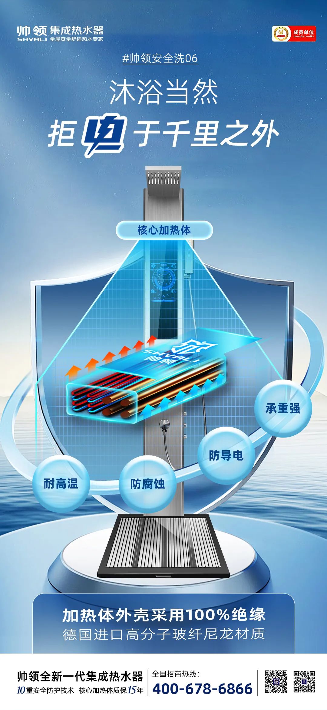 2021年,洞悉市场等安全问题弊病,帅领深耕广东顺德(全球制造业中心)精研技艺,以【用良心做人,匠心造产品】的产品理念,研发出革新行业的镍铬合金8核动态接力加热技术,以100%进口高分子玻纤强化尼龙绝缘材料,耐高温、防腐蚀、防漏电、防水垢,多重抗干烧技艺,加持美国进口高敏感水流传感检测,停水或水流低于2.8L/min,产品自动停止运行。更有温控探头实时检测温度。超过65°c,产品将在0.01秒内切断电源。多重细节防护,保护每一次沐浴安全。作为行业一流的全屋安全舒适热水定制专家,目前,帅领集成热水器已在覆盖全国300+门店,成为百万家庭的信任之选。