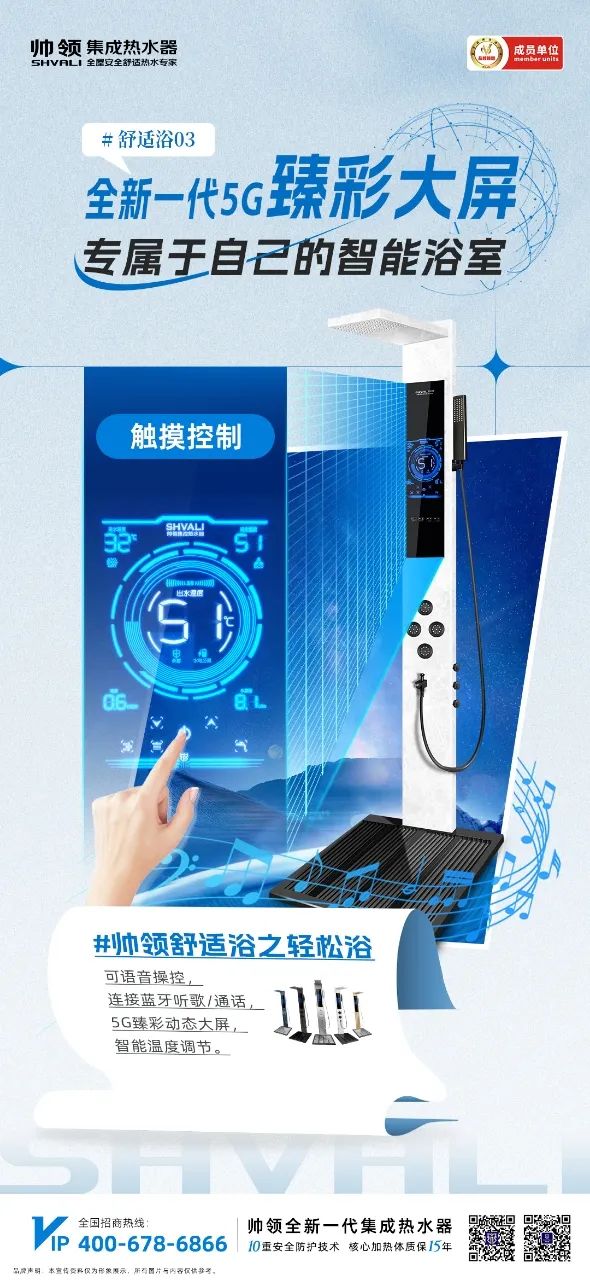 帅领集成热水器,带你开启每时每刻的沐浴仪式感。70英寸5G臻彩大屏,高清大屏一目了然,精准显示水温、流量、电量、 温度调节,热水器信息清晰明了。零温感触控按键、 四种出水模式随意切换、 指尖掌控,轻松操作,一键恒温、温度想要几度是几度。