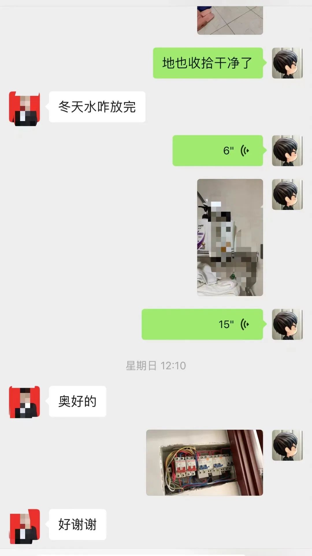 坚持服务至上,不负客户信任。到达现场后高工对热水器进行更换配件维修,韩玮同时就维修过程同步视频告知秦女士。不仅如此,在维修结束后,韩总与高工更是对现场进行了清理打扫,在出门时更是贴心地将电闸拉下、水闸关闭、门锁关闭,同时将以上动作全部以视频+照片的方式给予秦女士确认,秦女士微信、电话中一直不停的表示着感谢,韩玮和高工随后离开,此时已经中午2点左右,他两都没顾得上吃午饭,又奔着下一个需要服务用户去了。