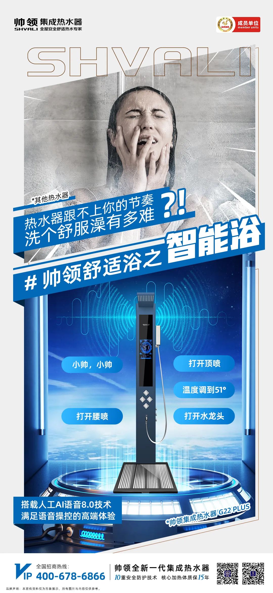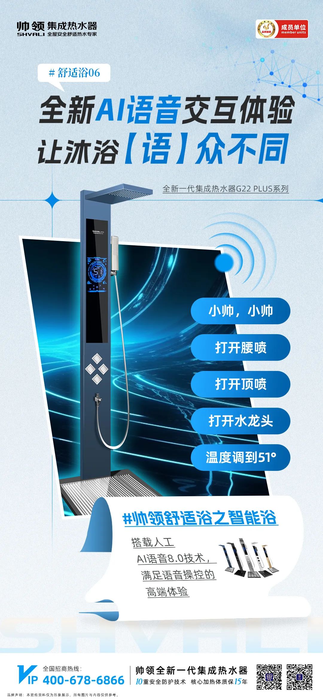 帅领集成热水器顺应时代,G22PLUS产品,已实现“智能化”小帅设计,在人性化操作、节电洗功能、静音降噪、温度记忆、控温以及多种模式选择上都体现出比上一代产品更为智能的特色,搭载人工智能语音8.0技术,小帅小帅语音功能即刻唤醒,全新AI语音人机交互系统,满足语音操控的高端体验、让沐浴【语】众不同。